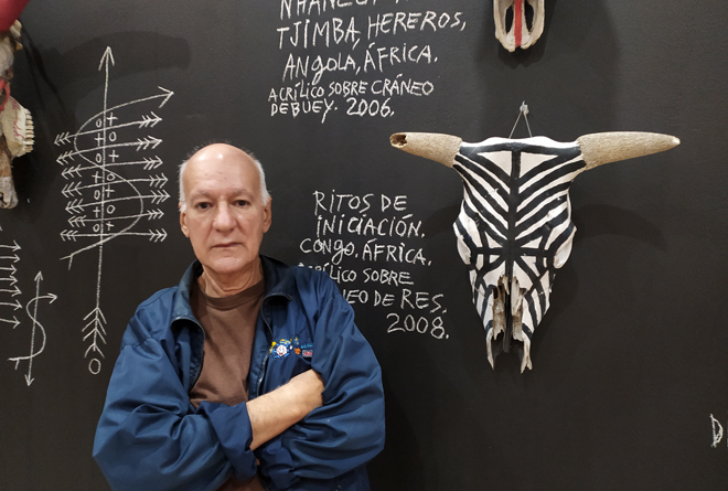 ¡Aquí están los cráneos de reses que he convertido, simbólicamente, en máscaras africanas!: “Cuba, Siete rayos”, que alude a Kimbisa, “Palo Monte” (óleo / cuero, sobre cráneo de res, 1998); “Pintura ritual”, Boi Sagrado Nhaneca-Humbe, Tjimba, Hereros, Angola, África, (acrílico sobre cráneo de buey, 2006); “Ritos de iniciación”, Congo, África, (acrílico sobre cráneo de res, 2008); “Máscara Zindunga”, Congo, Cabinda, Angola, Sociedad Secreta de los Bacongos, (acrílico sobre cráneo de res, 2017); “Pintura ritual”, Kenya, guerreros Samburu, 2006; “Máscara”, Congo, África, “Ancestros, divinidades e imponer disciplina”, (acrílico sobre cráneo de res, 2014); pintura ritual, “Guerreros Maasai”, Kenya, (acrílico sobre cráneo de búfalo, 2008.