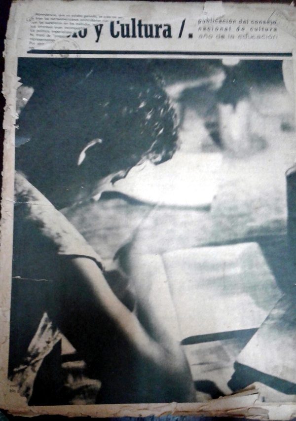 Iniciar este análisis nos obliga a hacer un breve recuento de la historia gráfica de la revista, aunque sea a muy grandes trazos. La revista comienza en el año 1961 con un número de prueba dirigido por Alejo Carpentier; este número nunca vio la luz por causas desconocidas según testimonia Leonardo Acosta, uno de sus redactores.1 El primer número aparecido en ese mismo año —“Año de la Educación”— llevaba el nombre de Pueblo y Cultura, respondía al Consejo Nacional de Cultura, su diseñador era Manuel Vidal y fue diseñado tipo periódico, con papel gaceta, en formato A3. La fotografía tenía un gran predominio y contaba con excelentes fotógrafos como Luc Chessex, Salas, Mario García Joya (Mayito)…, algo que después sería una línea importante de la revista. Incluimos la imagen del quizás único número que se conserva, en la propia revista Revolución y Cultura, aunque en muy mal estado.