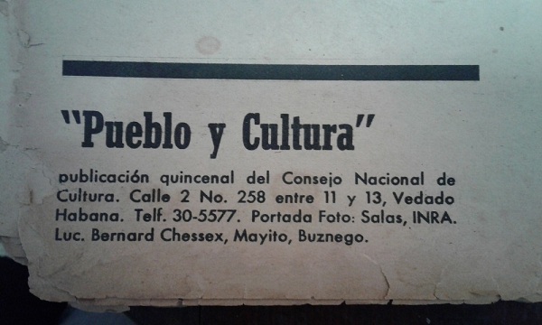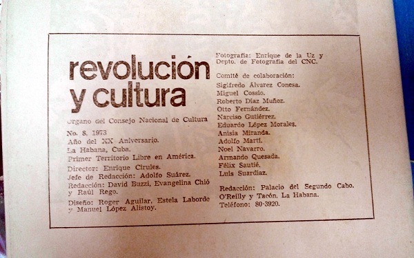 Era la revista del Consejo que creó Alejo. Cuando me contrató él tenía en mente crear esta revista. Después se llamó Revolución y Cultura. Fue donde conocí a Reynaldo González y a Héctor Villaverde. En el primer equipo de Pueblo y Cultura, en la calle 2, estaba Manolo Vidal como diseñador, hermano del pintor Antonio. Era un colectivo de trabajo pequeño, tres o cuatro personas, Reynaldo González entra un poco más tarde. Después nos mudamos para la sede de Marianao, en el edificio del ayuntamiento, y luego para el Palacio del Segundo Cabo. Entra también Villaverde. Se cambia la edición que era sobre papel gaceta, así como la Gaceta de la Uneac, y con el cambio de nombre viene la modificación de formato y una impresión mucho mejor.
