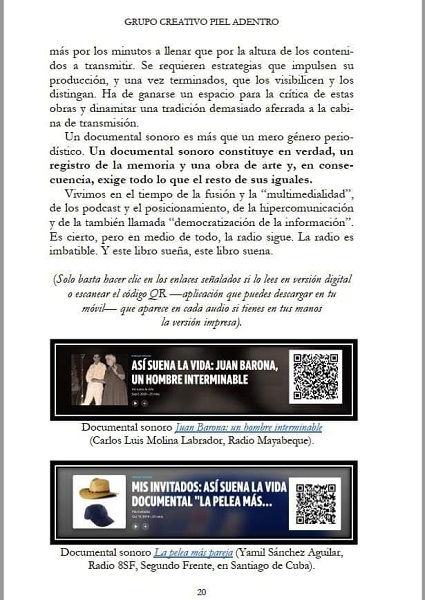 Un libro sonoro, he insistido, pues no solo habla en sus letras de la radio, sino que brinda la posibilidad, a través de los códigos QR, de escuchar varios programas seleccionados, una condición a la que aún no hemos accedido demasiado en el universo editorial cubano.