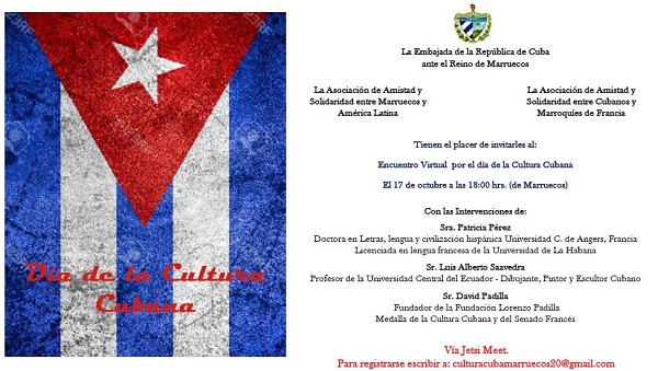 Con el copatrocinio de la Embajada de Cuba en Marruecos, la Asociación de Amistad y Solidaridad entre Marruecos y América Latina y la Asociación de Amistad y Solidaridad entre Cubanos y Marroquíes de Francia, se celebrará el Día de la Cultura Cubana, el próximo 17 de octubre.