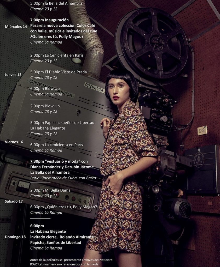 La cita ofrecerá una muestra de la vinculación entre cinematografía, diseño de vestuario pensado para el cine y la moda. La selección fílmica que se presentará en los cines La Rampa, 23 y 12 y el Patio de la Cinemateca de Cuba, incluye películas que representan hitos de la historia del cine, tal es el caso de Mi bella dama, dirigida por George Cukor en 1964, sobresaliente por su significación estética y cultural.