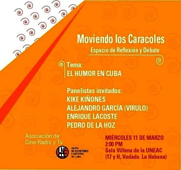 Desde esta premisa se desarrolló, en la sala Rubén Martínez Villena de la Uneac, el espacio de debate Moviendo los caracoles, dedicado en esta ocasión a la representación del humor en los medios de difusión masiva. A partir de ese empeño contó con la presencia de varios miembros afiliados al Centro Promotor del Humor y parte del equipo del popular programa televisivo Vivir del Cuento.