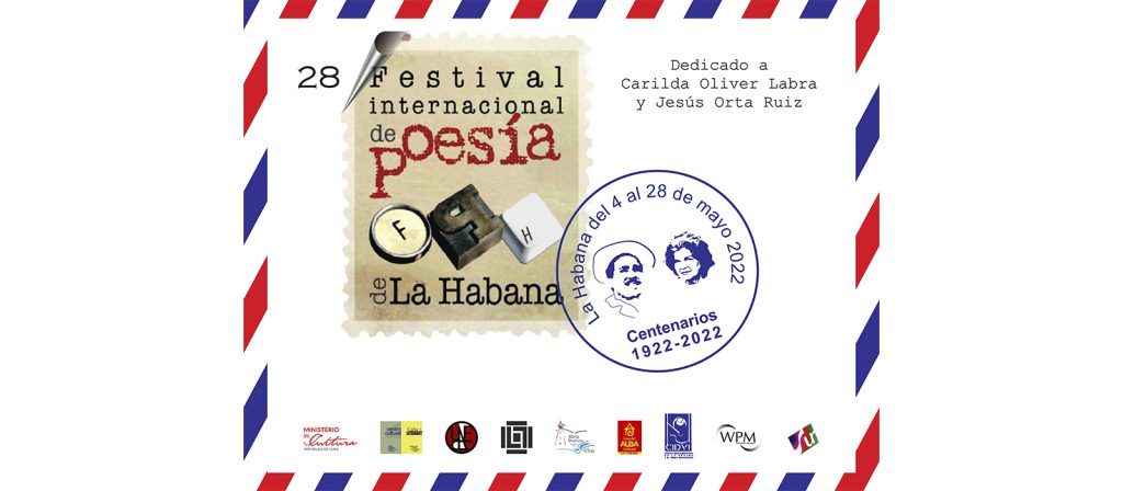 El Centro Cultural CubaPoesía, la Sección de Poesía de la Asociación de Escritores de la Unión de Escritores y Artistas de Cuba, el Instituto Cubano del Libro, el Ministerio de Cultura, la Casa del Alba Cultural de La Habana, El Centro Iberoamericano de la Décima y el Verso Improvisado, con el auspicio del Movimiento Poético Mundial y el Proyecto Cultural Sur, convocan al 28 Festival Internacional de Poesía de La Habana, y a su Mitin Poético Virtual, del 4 al 28 de mayo de 2022, en el centenario de los poetas cubanos Carilda Oliver Labra y Jesús Orta Ruíz, y de los libros Tierra baldía, de T. S. Elliot, y Trilce, de César Vallejo.