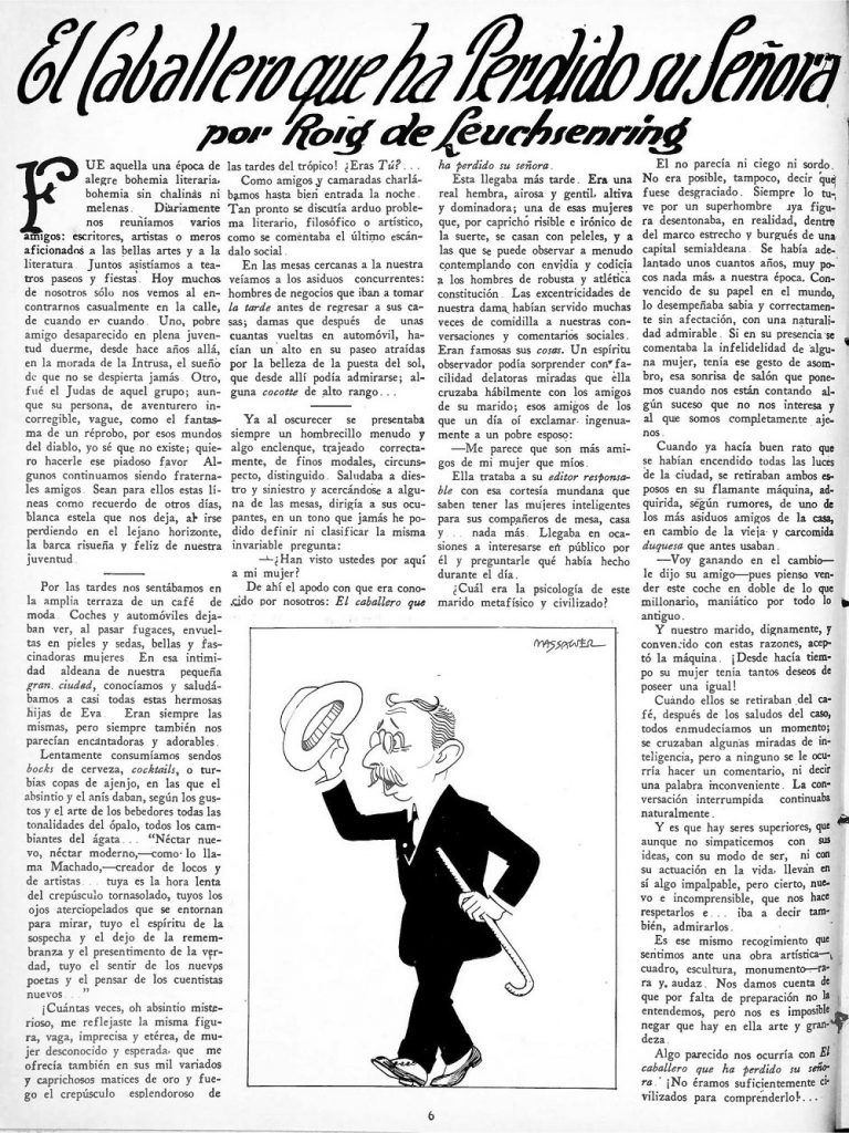 [2] A manera de ejemplo, “El caballero que ha perdido su señora” apareció originalmente en Gráfico (noviembre de 1916) y fue reproducido en El Fígaro (septiembre de 1918); Cuba Contemporánea (noviembre de 1922); El Heraldo de Cuba (octubre de 1923) y Carteles (enero 1925).