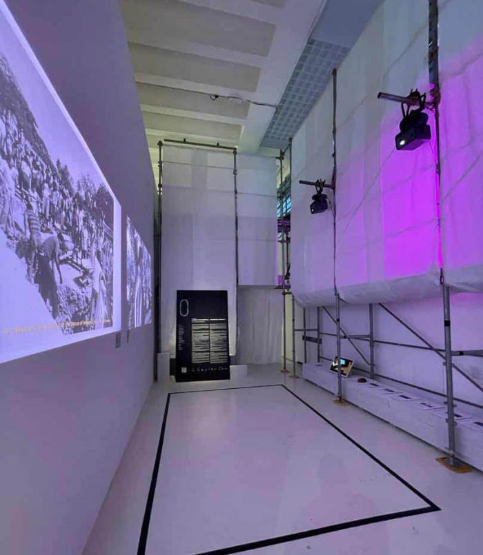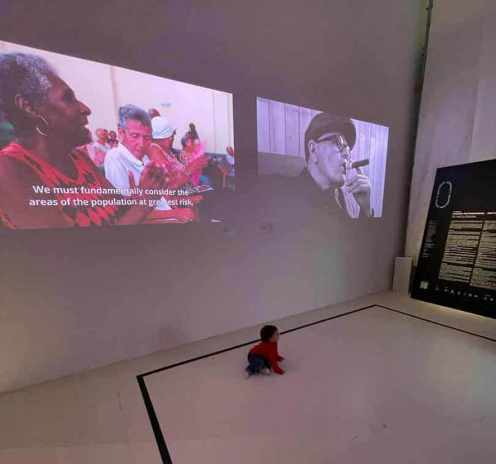 Desde los andamios se proyectan materiales audiovisuales, para generar un espacio inmersivo, documentales realizados para esta edición de los autores Yoel Guerra, Felipe Dulzaides, así como el documental Elogio a la restauración.