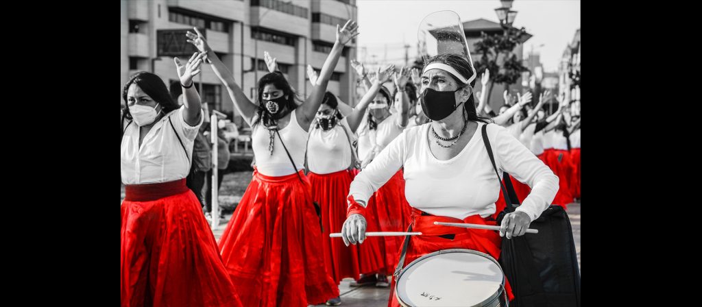 Otras actrices creadoras, las que componen el Grupo Cultural Yuyachkani, han aprovechado su enorme arsenal de creatividad escénica y sus experiencias en pasacalles para sumarse a otras organizaciones de mujeres y a las artivistas de los grupos culturales “Warmikuna Raymi” y Collera Red para incorporarse a las manifestaciones populares a raíz del golpe parlamentario de noviembre del 2020 y la crisis creada en el Perú. Así participaron en la primera Marcha Nacional. Marea Roja, fue primero el nombre de un movimiento y luego una acción callejera concreta, que a raíz de la segunda Marcha Nacional se tituló Marea Roja, ponte el alma. Fue una acción hermosa por la justicia, por condiciones de vida dignas y por el derecho a la protesta, cargada de simbología, con los colores patrios y los versos de César Vallejo como inspiración y carne del discurso.[4]
