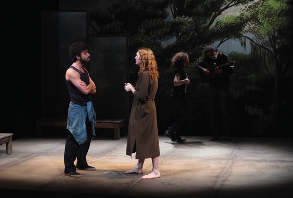 La puesta en escena resuelve con prodigioso sentido de la síntesis cada uno de los pasajes, más o menos íntimos o grupales. Bastan una plataforma cuadrada con dos escalones delante, y cerrada al fondo por un panel en el que se proyecta una floresta restallante, dos bancos con múltiples funciones que sirven para sentarse o navegar, y a la derecha hacia el fondo, algunos instrumentos que permiten que dos de los personajes acompañen la acción con música en vivo. Y la iluminación plenamente expresiva del director.
