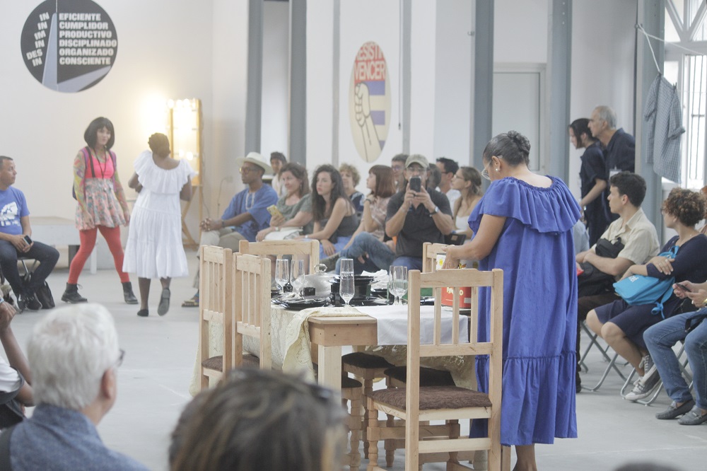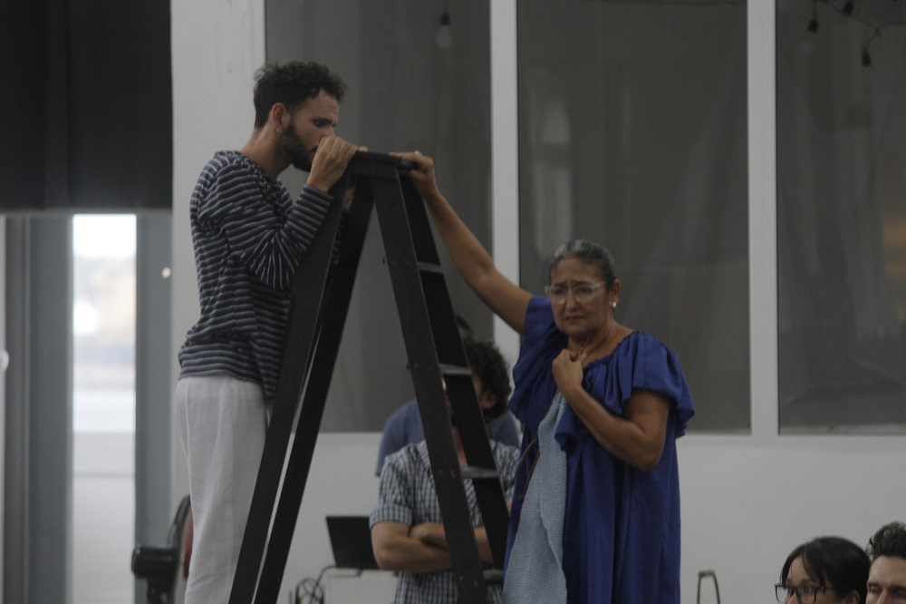 “Hacemos una especie de calentamiento aquí, entre todos, con baile y canto, y después caminamos hacia allá, y el público entrará por la última puerta, y el mar ahí, ¡mira! por las ventanas, está ahí cerca”. Nada es casual.