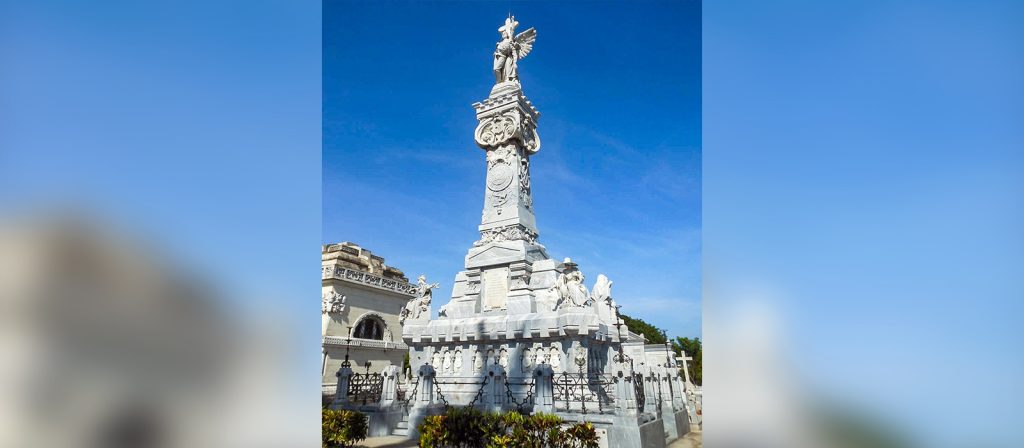 En esta obra, que acapara la atención de visitantes nacionales y extranjeros, las esculturas de mujeres sentadas en actitudes diferentes y de espaldas a una pilastra que se eleva desde el mismo centro del panteón, decorada en lo alto con laurel, guirnaldas y encinas entrelazadas que significan la gloria y la fortaleza. En la cara de la pilastra que da a la avenida Cristóbal Colón pueden observarse varios trofeos y los escudos identitarios de Cuba y España, de La Habana y del Cuerpo de Bomberos.