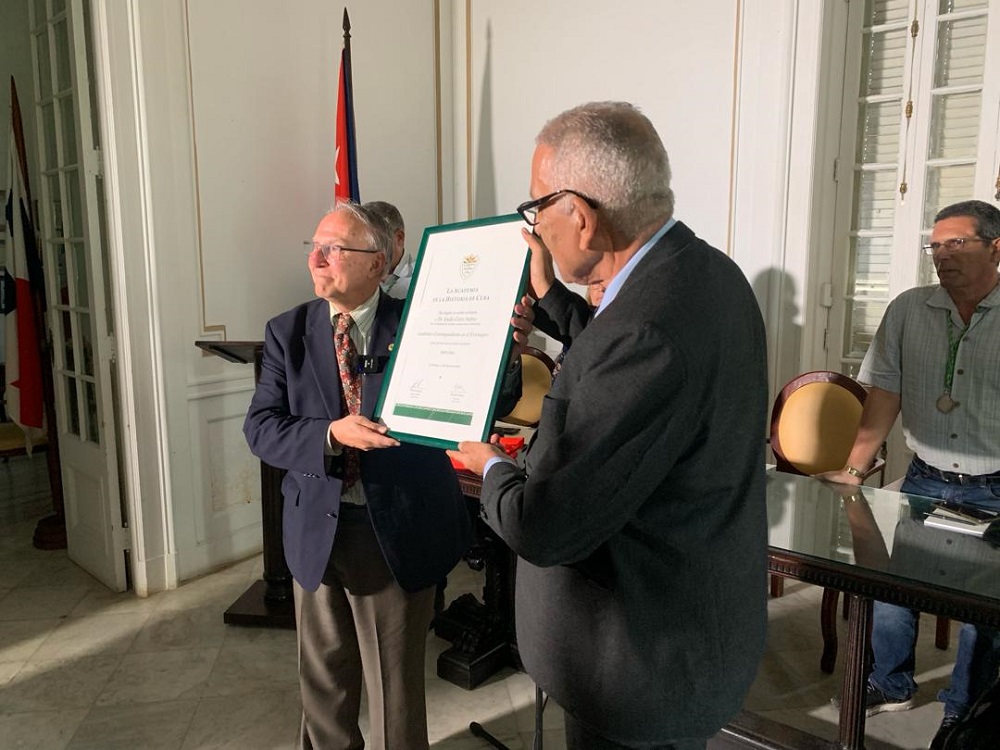 Una vez terminados los discursos de rigor, Emilio Cueto recibió el diploma que lo acredita como Académico Correspondiente en el Extranjero de la AHC y un cuadro con la imagen de José Martí.