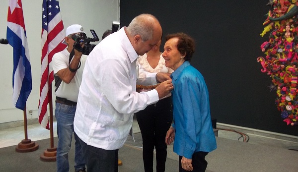 De manos del ministro de cultura, Alpidio Alonso, recibió la condecoración Haydée Santamaría la realizadora audiovisual estadounidense Estela Bravo, en acto celebrado este 4 de julio en la sala Che Guevara de la Casa de las Américas.