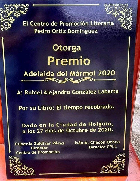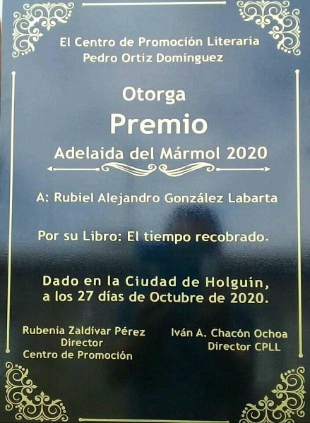 El escritor holguinero Rubiel Alejandro González Labarta obtuvo, con el cuaderno El tiempo recobrado, el Premio Nacional de Poesía Adelaida del Mármol en su XVIII edición, según el acta del jurado integrado por Kenia Leyva, Luis Yuseff y Ronel González.