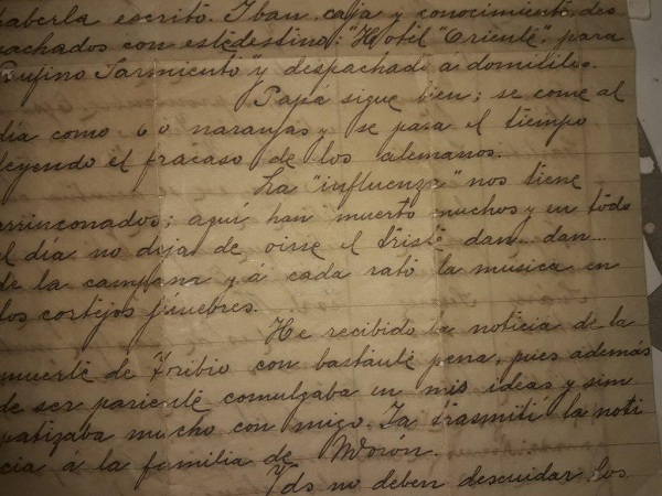 Por puro azar, mientras buscaba documentos en casa de alguien muy querido en la ciudad de Cienfuegos, descubrí una carta fechada el 17 de noviembre de 1918, dirigida a un tal Rufino Sarmientos y firmada por su primo, Guillermo. A estas alturas, ningún miembro de esa familia cienfueguera reconoce al remitente ni al destinatario. Me permitieron conservar la carta porque me llamaron la atención varios fragmentos que aluden a lo que en aquella época se llamó “la gripe española”. Como es sabido, tal gripe no se originó en España, sino en los Estados Unidos, en la base militar Fort Riley, en marzo de 1918. Fue una influenza causada por el virus de la gripe tipo A, que causó la muerte de más de 50 000 000 de personas en el mundo, desde esa fecha (primer trimestre de 1918) hasta que se dio por controlada, en abril de 1920. Es la pandemia que más se asemeja a la actual, debido a su transmisión por vía respiratoria, su altísima contagiosidad y su alcance mundial. En Cuba se han llevado a cabo varias investigaciones al respecto, y se han encontrado reportes que dan cuenta de la mortalidad de esa influenza en nuestra Isla (cerca de 8 000 fallecidos). Se describe que el virus entró en nuestras fronteras a partir del buque Alfonso XIII, que trajo a bordo 44 enfermos de la llamada “gripe maligna”, el 18 de octubre de 1918. Ese mes provocó la muerte de 125 habaneros y se extendió la enfermedad a toda la Isla en noviembre de ese año. En la epístola que amablemente me regaló la familia cienfueguera, se lee: “La Influenza nos tiene arrinconados; aquí han muerto muchos y en todo el día no deja de oírse el triste dan… dan… de la campana y a cada rato la música en los cortejos fúnebres. […] Ustedes no deben descuidar los catarros, pues empieza uno a toser y va a acabar de hacer cají, cají al cementerio”.