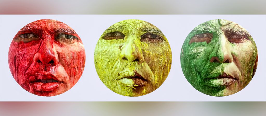Si nos detenemos en las dos piezas que le dan nombre a la exposición, habrá que notar que “Laboratorio 1” es una relectura del propio autor, en la cual aparece un autorretrato usando una máscara antigás como las que eran famosas en las trincheras de la Primera Guerra Mundial. En el respiradero de dicho dispositivo, sin embargo, vemos que brota una rosa. Aquí hay varios quiebres de sentido. Por una parte, la máscara separa al sujeto del mundo, lo protege, le da la posibilidad de sobrevivir a una toxina invisible que se intuye como parte de la atmósfera de la obra. No solo existe autorreferencialidad, sino referencias claras a un borde externo, un abismo que expresa peligro, acechanza, que se mueve en lo inestable. “Laboratorio 1” trata sobre la vida frágil, acoplada a dispositivos sin los cuales se perece al instante. Es como el paciente que se halla en coma y que posee apenas un aliento, una flor de esperanza que se asoma en medio de la angustia. En “Laboratorio 2”, una mujer —que es como un arquetipo de la esposa, la novia, la madre y la amiga— no muestra su cara, sino que se exhibe con la misma máscara antigás.