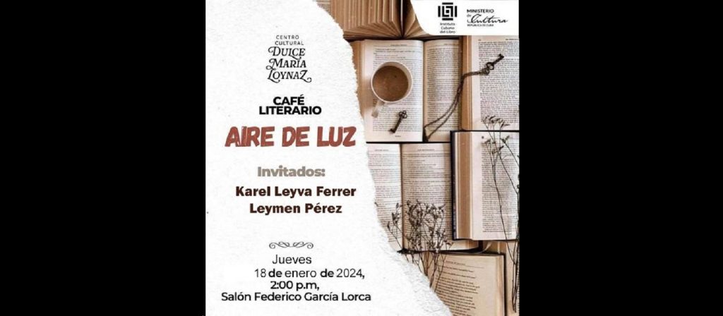 Nuevamente el Café Literario Aire de Luz, coordinado por la escritora Basilia Papastamtíu, abrirá sus puertas el próximo jueves l8 de enero, a las 2 de la tarde, para recibir en esta oportunidad a Karel Leyva y Leymen Pérez, dos autores de estilos diferrentes pero de una misma singular sensibilidad, que leerán poemas suyos y dialogarán con los asistentes.