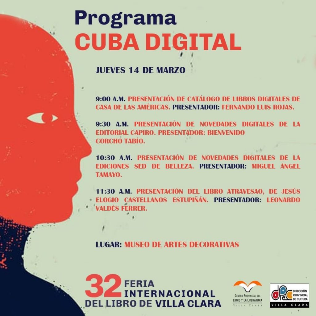 El Centro Provincial del Libro y la Literatura en Villa Clara invita al espacio Cuba Digital de la 32 Feria Internacional del Libro y la Literatura en esta provincia. La cita es en el Museo de Artes Decorativas de Santa Clara, en el horario de las mañanas, los días 14, 15 y 16 de marzo.