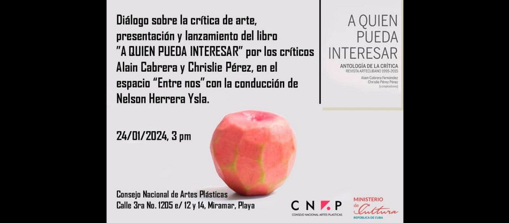 El espacio de debate y crítica “Entre nos”, a cargo del curador, investigador y crítico de arte Nelson Herrera Ysla, presenta en esta ocasión el libro: “A quién pueda interesar”, una antología de la crítica de la revista de Arte Cubano, compilada por los especialistas y críticos de arte. Alain Cabrera y Chrislie Pérez. Tendrá lugar el día 24 de enero a las 3 de la tarde en la sede del Consejo Nacional de Artes Plásticas, situado en la calle 3ra No. 1205 / 12 y 14, Miramar, Playa.