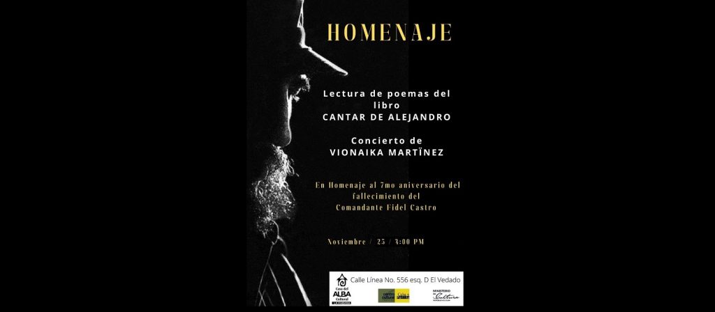 4: 00pm Espacio «Homenaje» . Lectura de Poemas del libro “Cantar de Alejandro” y Concierto de Vionaika Martínez e invitados.