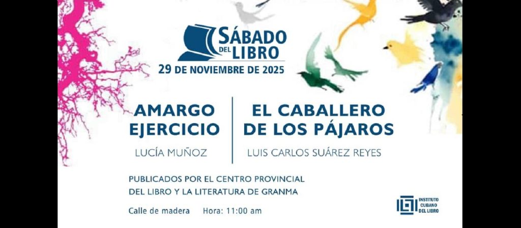 El tradicional espacio “Sábado del Libro”, que convoca el Instituto Cubano del Libro, presentará este 29 de noviembre los títulos El caballero de los pájaros, de Luis Carlos Suárez Reyes, publicado por Ediciones Orto; y Amargo Ejercicio, de Lucía Muñoz, publicado por Ediciones Bayamo.