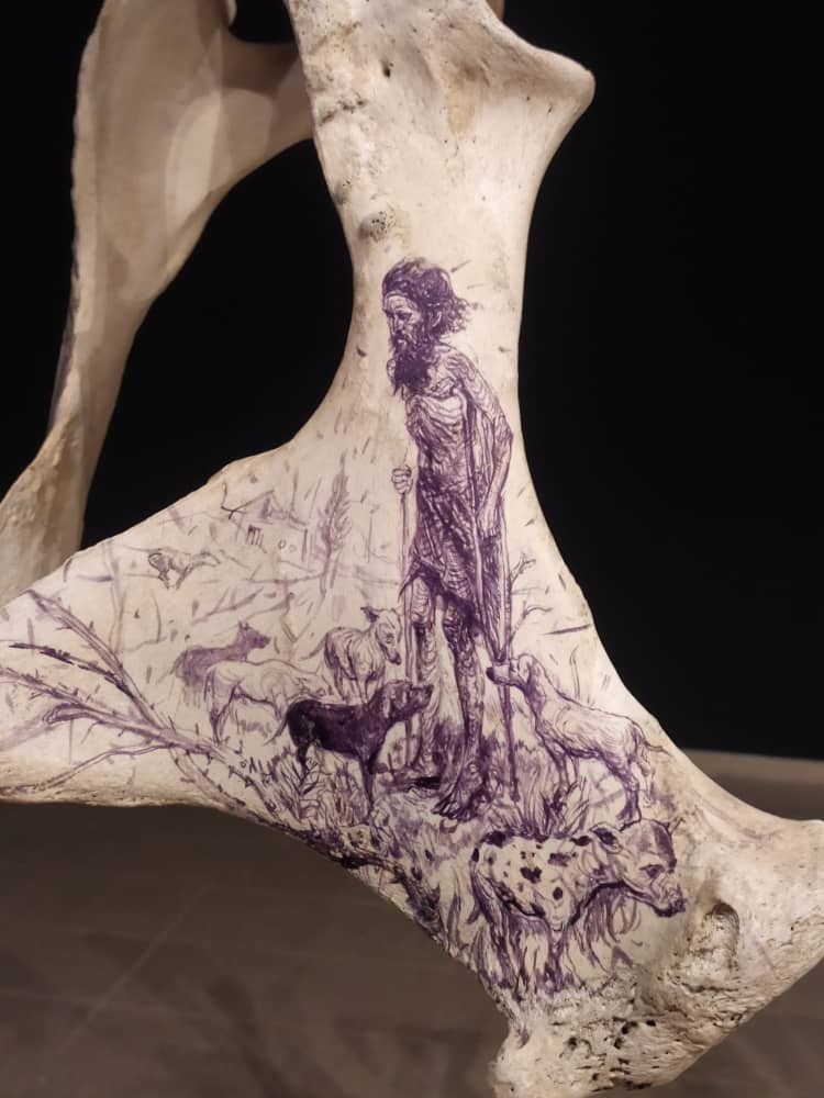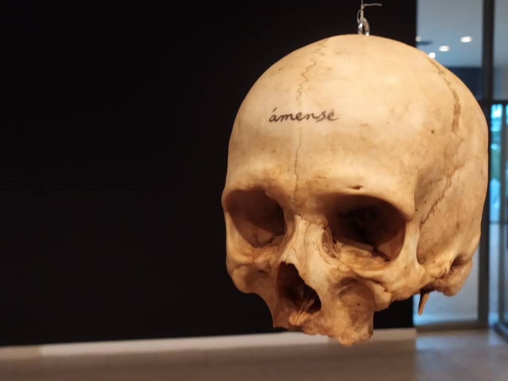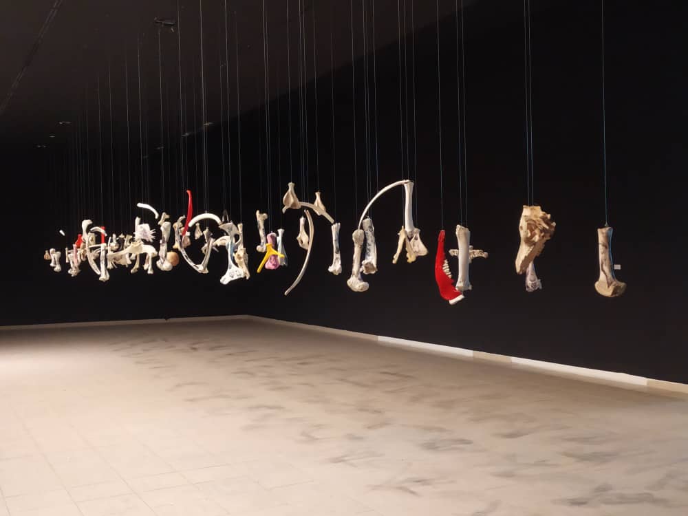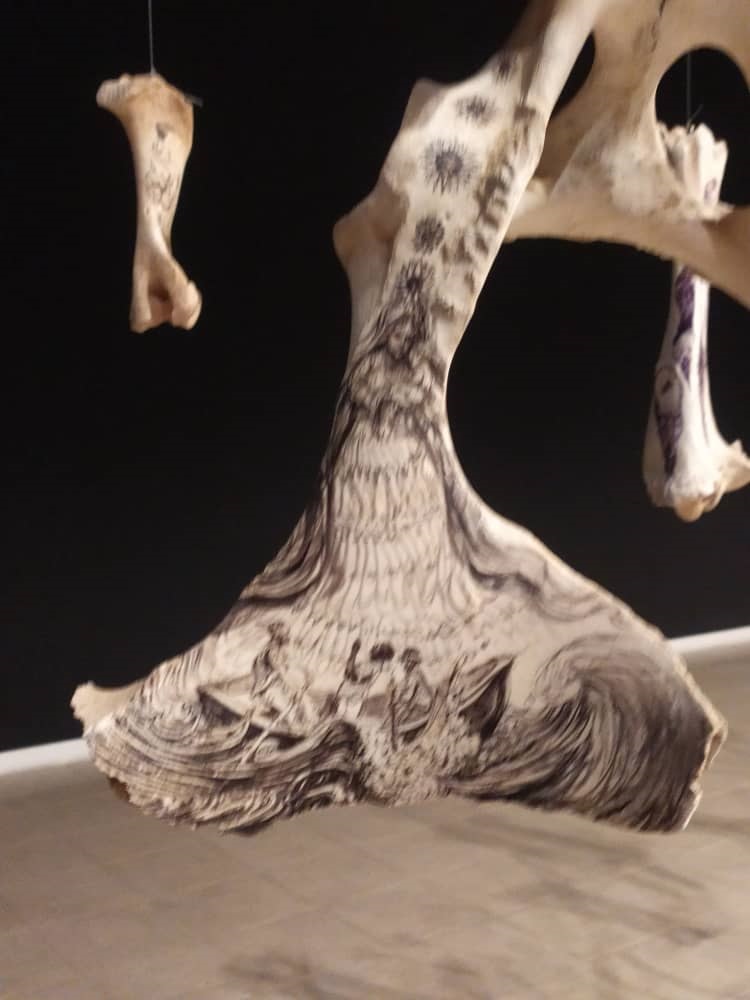 “En la sala de adentro, pintada toda de negro, está la instalación Médula que es realmente imponente por esos huesos colgados en la zona central de la galería: hay huesos dibujados, otros en blanco, otros pintados de rojo, otros de negro. Hay tres de ellos que marcan el hilo conductor de Médula: al centro un cráneo humano de una mujer que dice: Ámense. En el otro extremo una cabeza de cerdo con una palma pintada en el centro y, al final de la pieza, una cadera gigante de res que tiene dibujado en un lado del acetábulo a san Lázaro y en el otro a la virgen de la Caridad del Cobre. Es la salvación. Realmente es una obra con un alto contenido y signifiantes. Es una plataforma conceptual muy sólida”.
