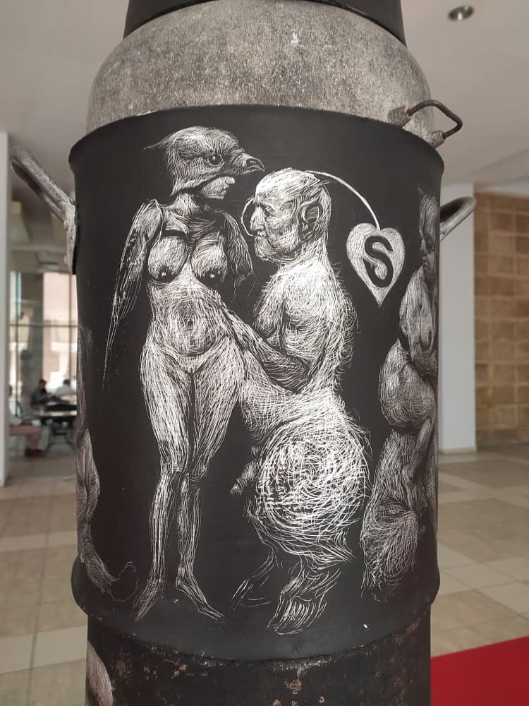 “También en la planta baja están estas pinturas que son más coloridas y que hacen alusión o tienen una relación con las torres de calderos. Y otra pieza que se titula Dios mío —que es como La ronda infinita— en la que está representada una cazuela grande en tonos grises, negros y azules y esos grafitis como si dibujara en la olla —lo mismo que hace en sus instalaciones— pero que tienen que ver con su vida personal. Hay alusiones a su esposa Súyu y a sus hijos y poseen una inmensa subjetividad”.