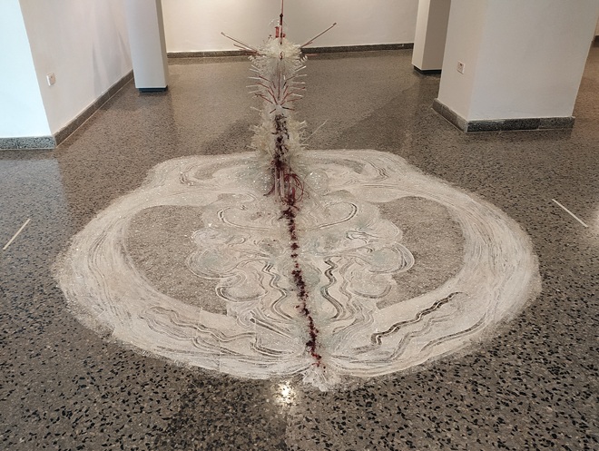 Miguel L. Osorio. “Bucle”, 2022. Utensilios de cristal de laboratorio quebrados y sangre de un seropositivo. 120 x 200 cm de diámetro.