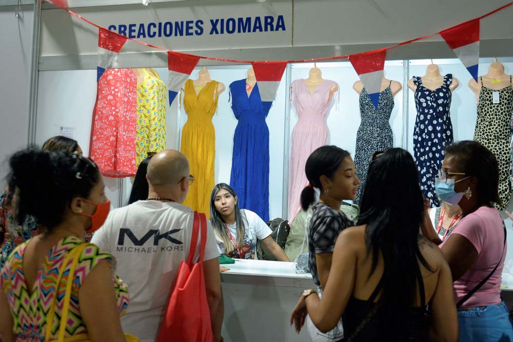 Aunque su principal línea de trabajo es la confección de guayaberas transformadas en vestimenta popular para todas las edades y sexos, exhibe también en su stand otras prendas de vestir, bordadas y tejidas a mano o a máquina, como blusas y vestidos. “En estas piezas, tanto los botones que provienen de la madera y son creados a mano, todos los adornos son de fibra natural. Eso nos convierte en el único proyecto en Cuba que realiza este tipo de labor”.