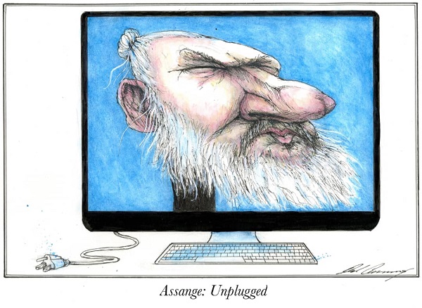 Estas caricaturas, realizadas por creadores de siete nacionalidades, nos acercan a visiones particulares del periodista y activista de Internet australiano, de los hechos que acontecen alrededor de su figura. Con humor ponen al descubierto el doble rasero existente a la hora de abordar la libertad de expresión.