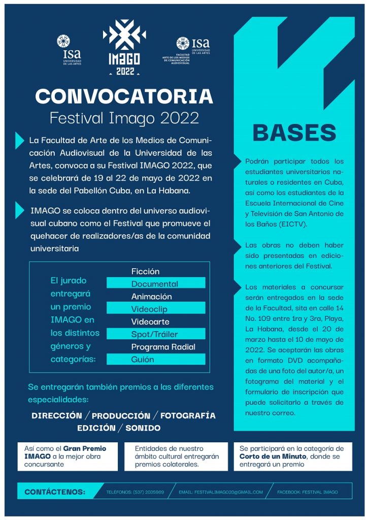 Después de la pausa obligada por causa de la incidencia de la pandemia de COVID-19 en Cuba, muchos eventos debieron esperar tiempos mejores para su realización. Este fue el caso del Festival IMAGO. Convocado por la Facultad Arte de los Medios de Comunicación Audiovisual (FAMCA) de la Universidad de las Artes (ISA), el evento arriba a su vigésima edición y, tras la suspensión de sus dos convocatorias anteriores, regresa con nuevos bríos.
