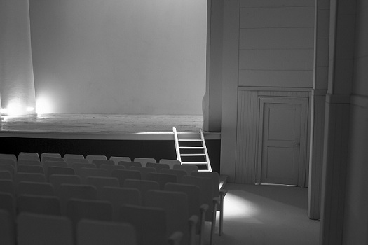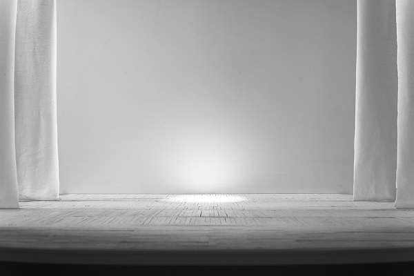Un escenario, completamente vacío, completamente blanco. Los cenitales agrisan lo justo para recrear la sensación de profundidad, el trampantojo. Vemos las lunetas, de espaldas o de frente, la breve escalera de acceso, el imperfecto tabloncillo, las puertas liliputienses que conducen a la oculta maquinaria del artificio, las pulcras bambalinas, los rincones carentes de vida. Carentes, en apariencia, pues allí palpita la existencia contenida, aun anónima, expectante: el gemido que nos hará girar la cabeza, las frases que nos removerán en el asiento, el grito que reptará por las paredes.