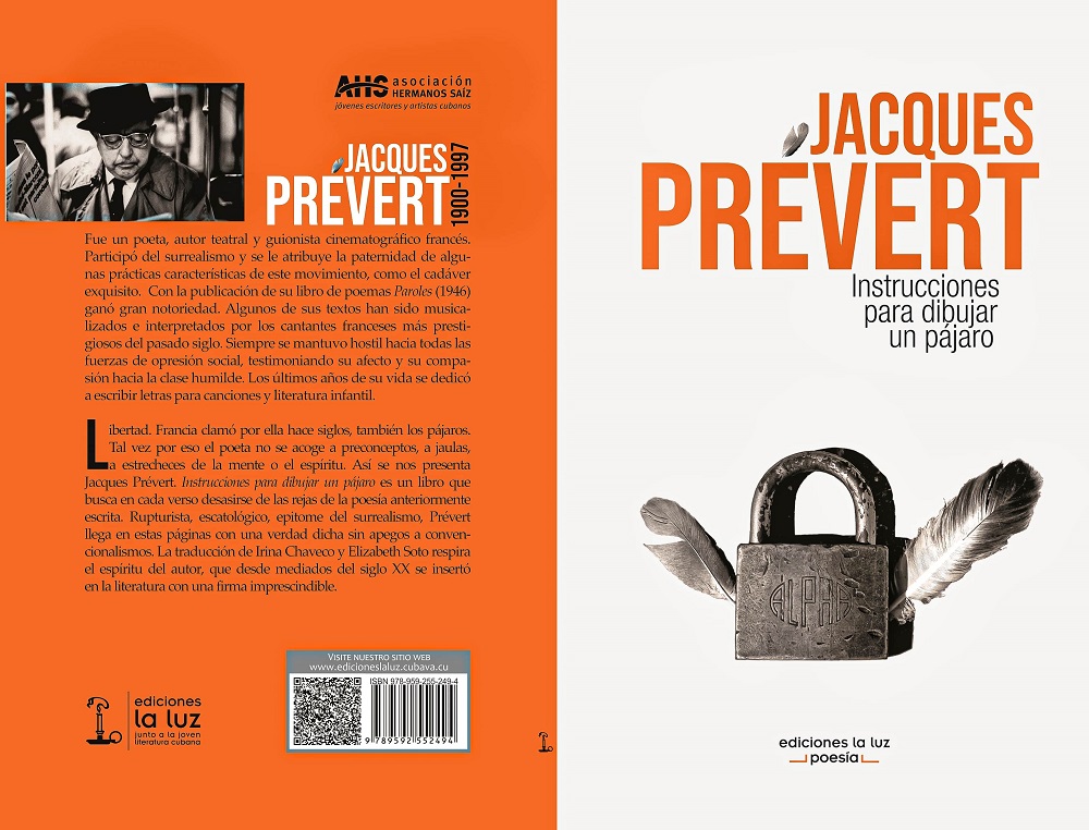 La publicación en Cuba de Instrucciones para dibujar un pájaro, selección de la poesía del francés Jacques Prévert, uno de los autores fundamentales del siglo XX, constituye un verdadero acontecimiento editorial hecho realidad por Ediciones La Luz, sello de la Asociación Hermanos Saíz (AHS) en Holguín, bajo la guía de Luis Yuseff y el trabajo de selección y traducción de las jóvenes Irina Chaveco Pupo y Elizabeth Soto.