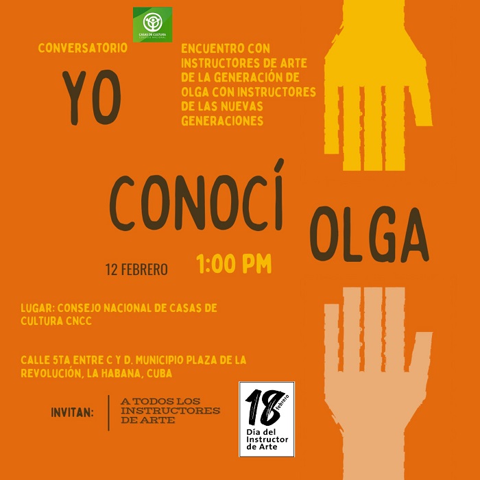 En ese sentido destacan, entre otras, la celebración de un conversatorio que con el título “Yo conocí a Olga Alonso”, reunirá en el Consejo Nacional de Casas de Cultura a varios instructores compañeros de Olga, que narrarán a las nuevas generaciones de instructores, importantes momentos compartidos con esta destacada promotora cultural. Asimismo, en la comunidad donde naciera Olga, radicada en el municipio capitalino San Miguel del Padrón, se efectuará la actividad denominada “En la comunidad” que tendrá como protagonistas a los instructores de arte de esa localidad.