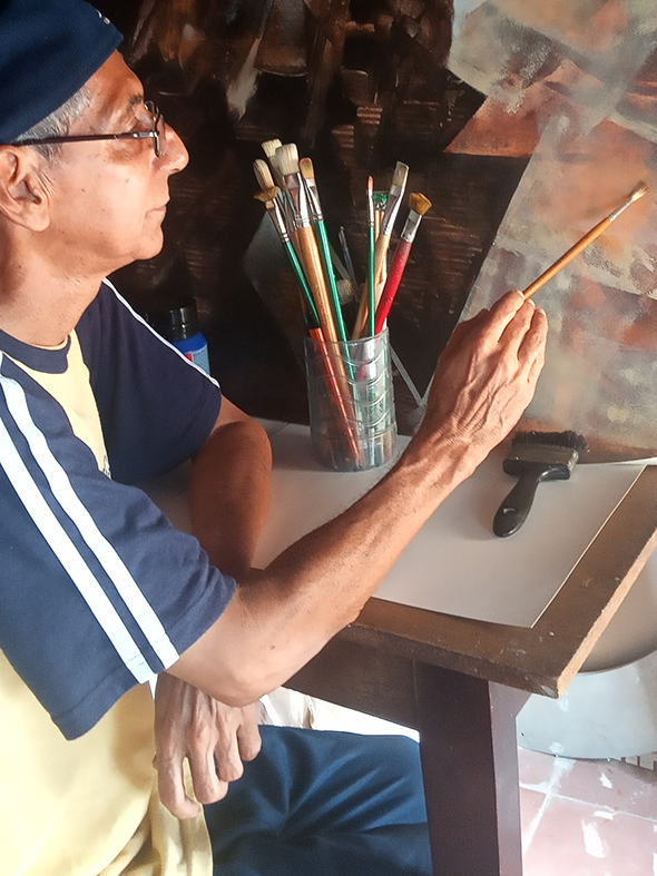 Con el deseo de conocer más sobre su vida profesional conversé con él cuando se encontraba en pleno proceso de creación en su propio taller, que ocupa la segunda planta de su hogar. Entonces dejó a un lado el quehacer pictórico para responder a mis disquisiciones estéticas.