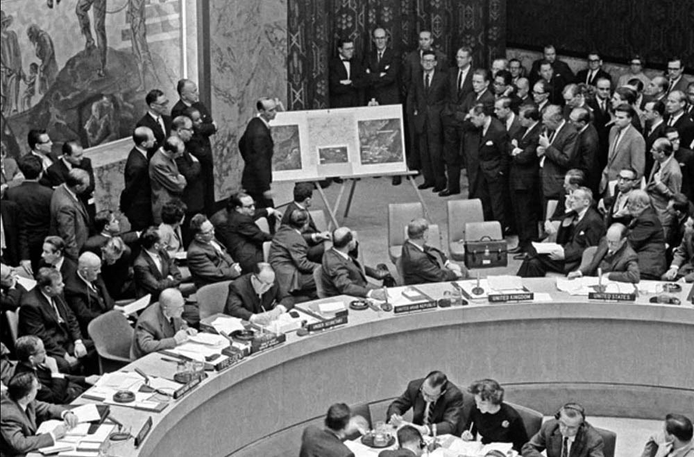 En horas de la tarde de ese día 25 de octubre se efectuó una nueva sesión del Consejo de Seguridad. El embajador soviético, Valerian Zorin, fue interrumpido en medio de su intervención por Stevenson, quien en tono inquisitivo, le pidió que dijera si en Cuba había o no armas ofensivas. Mientras Zorin se negaba a dar una respuesta directa a esa pregunta, Stevenson introdujo en la sala las ampliaciones de las fotos tomadas por los U-2, en las que se veía claramente los bombarderos y las posiciones de lanzamiento que se construían para los cohetes. El efecto fue devastador y el lance constituyó un fracaso total para la diplomacia soviética.