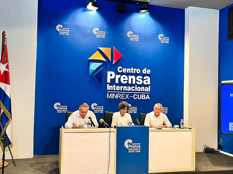 Juan Rodríguez Cabrera (presidente del ICL, a la derecha), Iyaimí Palomares (directora de la Cámara Cubana del Libro) y Víktor Viktorovich Koronelli (embajador ruso en Cuba), expusieron detalles de la FILH durante la conferencia de prensa. Foto: Cortesía del ICL