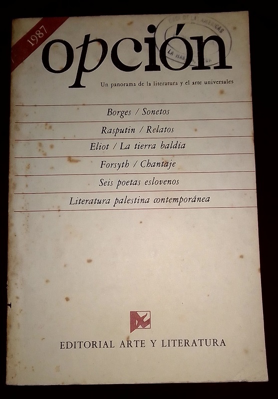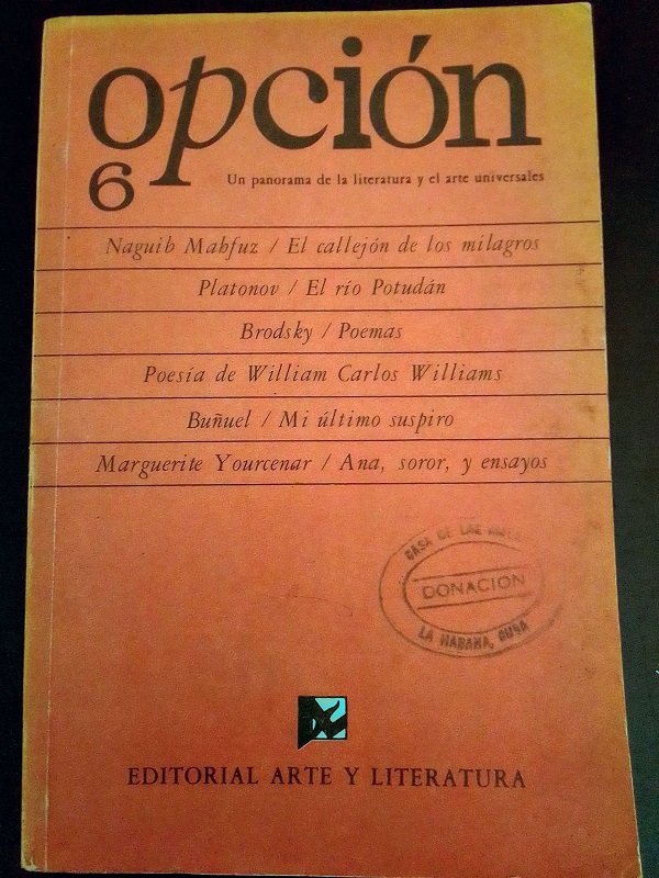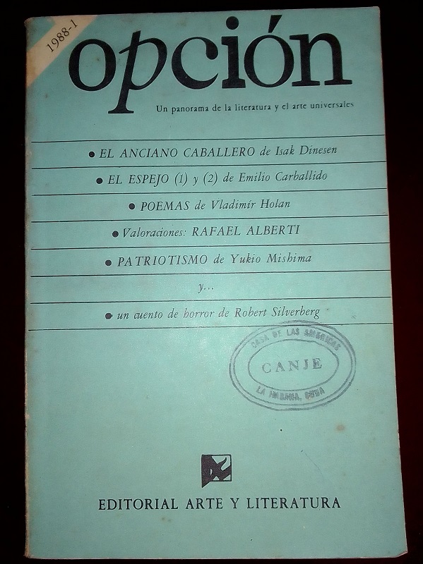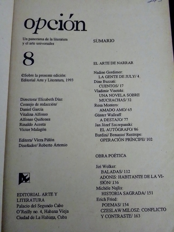 La otra fue la revista Opción. Lo más importante, lo que le dio su valor y aceptación mayoritaria, fue su concepción central: iba a estar dedicada a la literatura contemporánea y a los autores más importantes dentro de ella, con obra reconocida, premios, consagrados por la crítica especializada, pero también autores emergentes con una obra de calidad literaria ya aquilatada. Autores que no se conocieran en Cuba por no estar publicados aquí o sí conocidos, pero con obras importantes desconocidas, es decir, no publicadas entre nosotros. En este sentido, también algunos no tan contemporáneos, de épocas anteriores. La nota de contracubierta que aparecía en los diferentes tomos de la revista lo definía muy bien: “Opción es el título que la Editorial Arte y Literatura ofrece al público lector como una solución ágil a la creciente demanda de la vasta literatura universal, preferentemente la contemporánea, con variadas alternativas temáticas y genéricas de muchos países para distintas preferencias y diferentes tipos de lectores”.