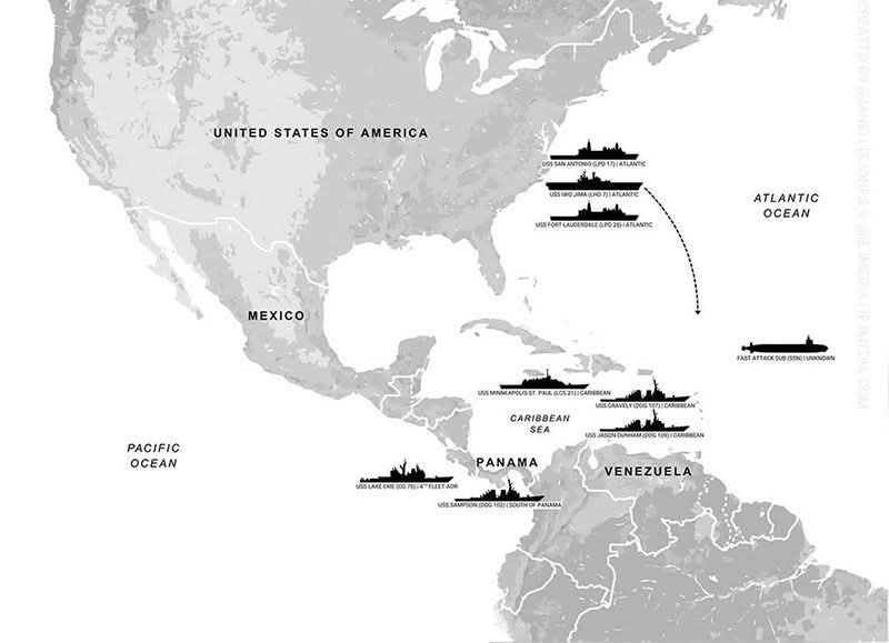 El despliegue de armamento bélico que ha movilizado ocho barcos de guerra, un submarino nuclear y miles de misiles y las amenazas que llaman y convocan a la guerra por parte de autoridades del gobierno de Trump se constituyen en una amenaza para la seguridad de la región del Caribe y de toda América Latina, una violación a la soberanía y en una agresión del gobierno de los Estados Unidos contra los pueblos de la región.