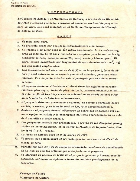 Un gusto sin lugar a dudas comunicarme con los lectores cubanos y responder sus preguntas. En enero de 1979 el Ministerio de Cultura, a través de su Dirección de Artes Plásticas y Diseño, convocó al Concurso Nacional de proyectos para un vitral en el Salón de Recepciones del Consejo de Estado de Cuba.