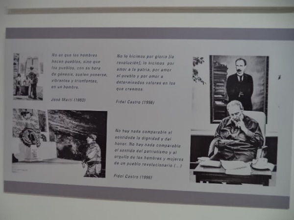 Esta exposición, conformada por veinticinco fotografías, muestra la unión de dos figuras descollantes de nuestra patria que son el sustento ideológico de la Revolución cubana: Martí y Fidel. Se escogieron imágenes poco vistas de nuestro líder histórico, guiadas a través del pensamiento martiano. Esa guía de conducción del pensamiento de Martí a la praxis revolucionaria de Fidel, es lo que nos propusimos mostrar en esta exposición, que contó con la excelente curaduría de los trabajadores de la Oficina del Historiador, específicamente de la Dirección de gestión cultural, integrada por especialistas en artes visuales, unidos al Centro de Estudios de Fidel.