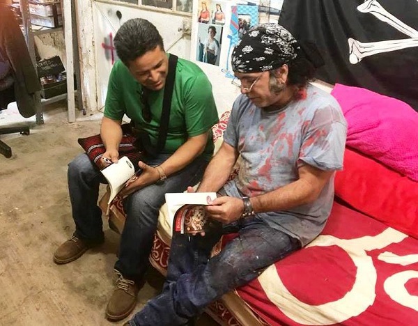La Sala de Cine Universitario del Museo Regional de Historia de Colima ha sido intervenida ―invadida― por Waldo Saavedra, pintor cubano radicado en Jalisco, un artista de otra dimensión. Ha sido generoso, ha cedido un fragmento de su mural como imagen para la nueva aventura de este libro. Me voy hasta su casa a agradecerle, junto a Gilda Callejas, la dama que puso en mis manos la llave del mundo.