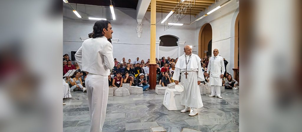 Iluminados por las llamas de un apagón, los presentes en una de las calles principales de Santa Clara, esperamos con paciencia a que repusieran el servicio de lo que parecía ser una especie de parábola extradiegética. En verdad, nos adentramos en una obra que versa sobre nuestra propia realidad, vista desde un punto metaficcional en el cual los hombres y mujeres de hoy se vuelven hacia los de ayer. En el primer salón de la Galería Provincial, nos recibió una performance que aludía a formas y enrevesamientos del alma, una especie de poesía a la cual había que darle el sentido que quisiéramos en medio del drama anunciado. Nos condujo, a través de los aposentos, una alfombra hecha con sacos de azúcar de épocas pretéritas. El mensaje era que viajamos al pasado y que todo lo que es sólido se deshace para volver a aparecer en medio de la escena. Incluso, si ello fuera el único tema abordado por la pieza, su tratamiento bastaría para colocarlo entre lo más notorio.
