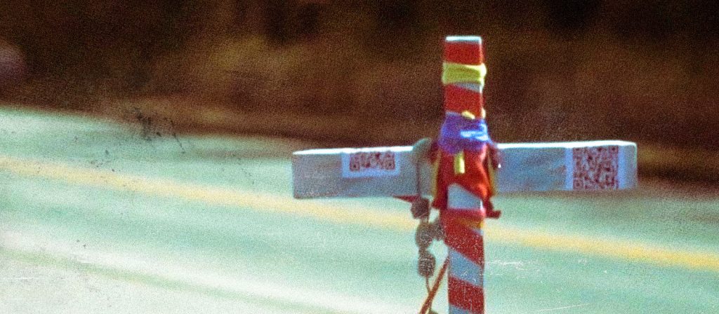 Fueron tres días de marcha, solo interrumpida para comer y dormir. “Setenta y dos horas de rito, de entrega y de suspensión”. 85,7 kilómetros y 866523 pasos —“cada paso una despedida, una revuelta”—. En distintos puntos del trayecto algunos de los artistas realizaron performances situacionales, movidos por distintos cánones expresivos, casi siempre acompañados por la música que ejecutaron sus compañeros, e invariablemente por la acción de plantar en la tierra una cruz de madera, rústica y artesanal, intervenida por cintas, ramilletes de flores silvestres y grafías manuscritas, con la belleza y el colorido del arte popular, que dejaron como una marca de su paso cerca de la cuneta de la autopista o junto al camino apartado. Construyeron así un repertorio de ofrendas dejadas en el espacio público como archivo efímero de la memoria y el duelo.