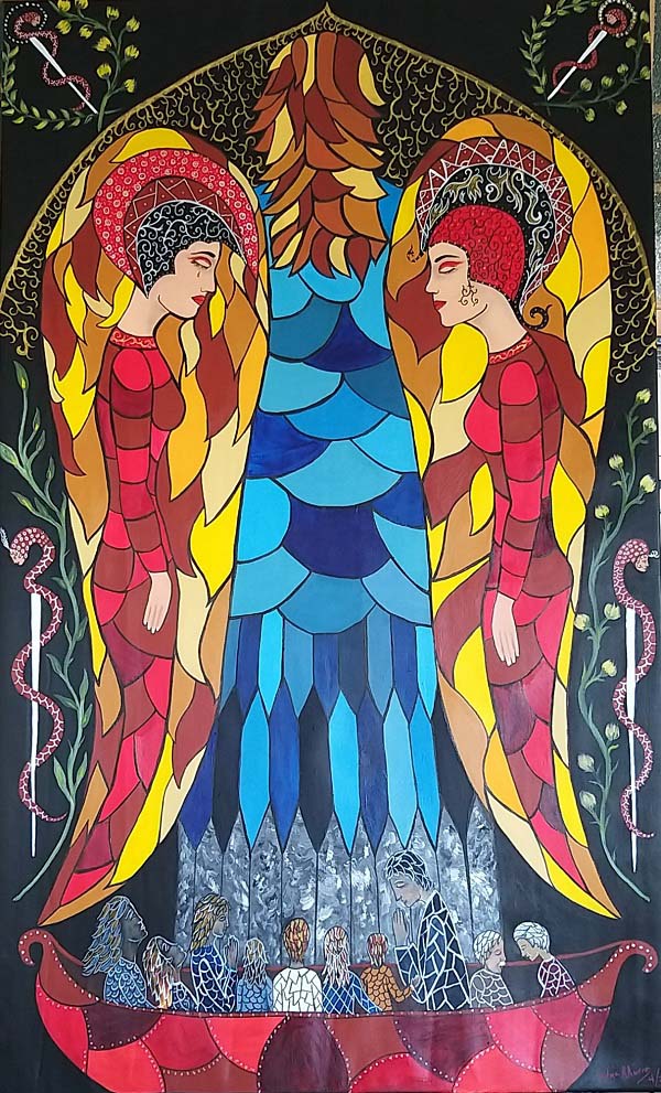 En esta ocasión la figura central es un Ángel de espaldas que no escucha a los que ruegan a sus pies desde una barca sin mar. El caduceo, símbolo de la medicina, rodea el vitral. Compartí este trabajo en Facebook como muestra de lo que hacíamos los artistas en nuestro encierro y sentí que esa plegaria personal se multiplicaba en cientos de voces”.