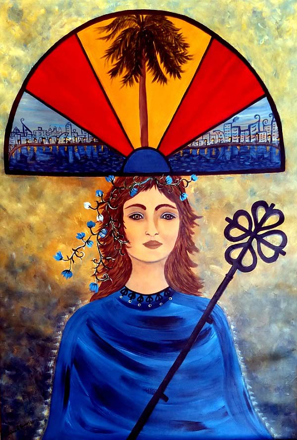 No las pinté en ese orden, realmente la primera que surgió fue Mediopunto. Una obra en acrílico sobre lienzo de 100 x 70 cms. Musicalmente esta parte corresponde a lo que podemos llamar el segmento del concierto dedicado al violín, que para mí es la parte más emblemática del mismo; es una bellísima habanera con una melodía arrobadora. Fue esa habanera la inspiradora de la obra pictórica y la expresé como una mujer habanera armada con la Cruz de Calatrava en alusión a La Giraldilla y coronada con un mediopunto, donde puede verse la ciudad en azul y, entre los rojos del vitral, una palma real solitaria.