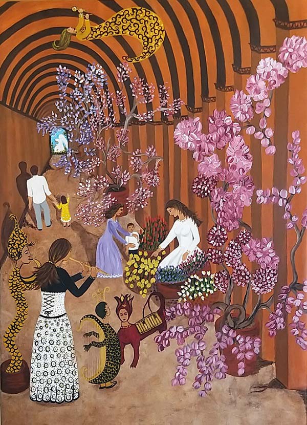 Yo estuve dos meses con una limitación física provocada por una caída que me impidió pintar, no obstante, durante ese tiempo surgían imágenes en mi cabeza siguiendo la música. A finales de enero comencé con un cuadro pequeño, una madera pintada en acrílico y barnizada. La titulé Tras las rejas, y quise incitar con ella la interrogante de quién estaba realmente libre, ¿el que mira o los personajes que aparecen en un bello jardín tras las rejas? Una pregunta que viene ahora, quizás, a ser más reveladora en esta etapa de cuarentena que estamos viviendo en la que la libertad y las opciones las debemos buscar más dentro de nosotros mismos que en los espacios supuestamente libres.