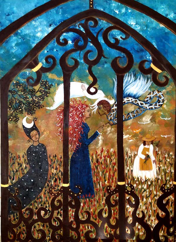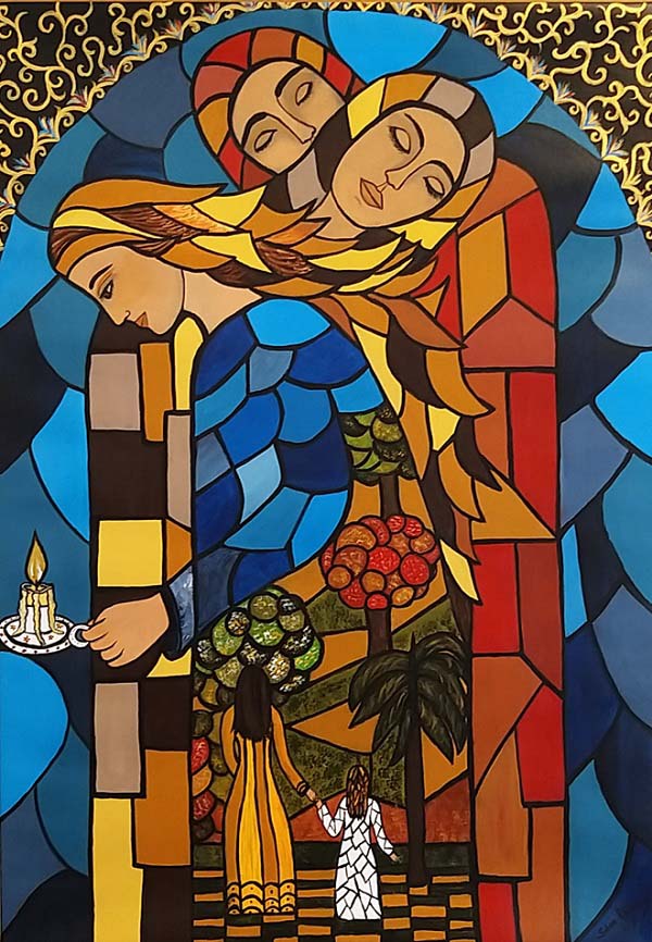 Terminada esta y aún con el lienzo húmedo, preparé el boceto de Vitral. Surgían las ideas como guiadas por la música, con una fluidez inusual. Nunca había pintado un vitral, es por eso que este cuadro marca una diferencia en mi estilo, en mi forma de expresión, en mi pincelada e, incluso, la paleta de color se vuelve más intensa y desprejuiciada, quizás justificada por los vivos colores que usualmente cobran los cristales del vitral cuando los atraviesa la luz. La técnica usada es acrílico sobre lienzo y mide 100 x 70 cms.