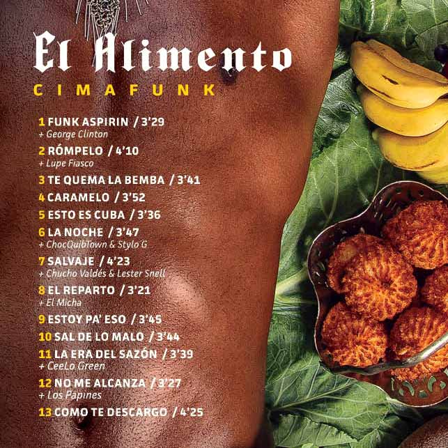 Con cierto aire de desenfado y ese carisma característico, Cimafunk trae El alimento, su más reciente producción discográfica. Un compendio de trece temas, todos de su autoría, aunque también comparte créditos con varios de los artistas internacionales invitados, entre ellos, el gran pianista cubano Chucho Valdés; los norteamericanos George Clinton, Lupe Fiasco y CeeLo Green; la agrupación rumbera cubana Los Papines; el grupo colombiano ChocQuib Town; el jamaiquino Stylo G, y el reguetonero cubano conocido como El Micha.