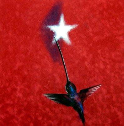 Otro símbolo contemporáneo de Cuba es Fidel, y Rancaño lo pintó de múltiples formas, ya fuera como transfiguración de otros héroes, o como un anciano venerable que medita frente a un colibrí, o como ese mismo colibrí que acaricia con su pico larguísimo la estrella del Comandante en Jefe.