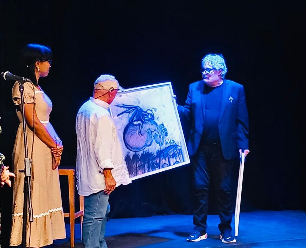 El premio se acompaña con una obra del artista visual Nelson Domínguez, premio nacional en esta especialidad, quien le entregó su pieza como muestra de amistad y admiración al autor de “Acuérdate de abril” y otros muchos temas memorables para los cubanos.